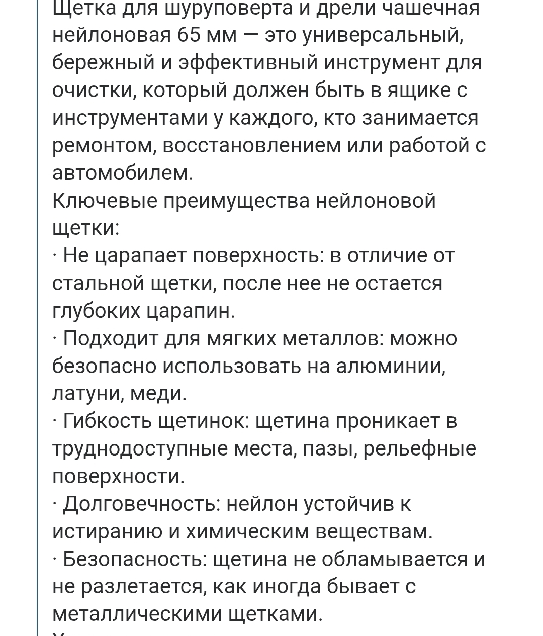 · Безопасность: щетина не обламывается и не разлетается, как иногда бывает с металлическими щетками.